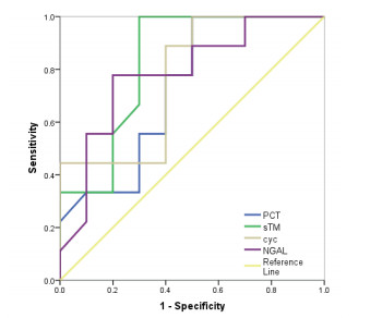 基于以上结果,筛查出4个指标:PCT、sTM、Cys C、uNGAL是发生AKI的可疑影响因素,需进行多因素研究。多因素分析选择的统计学方法为Logistic回归分析。