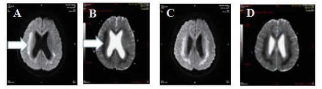 图 1 A.T1序列/B.T2序列/C.FLAIR序列均无异常;D.DWI系列上为高信号(箭头所示) |