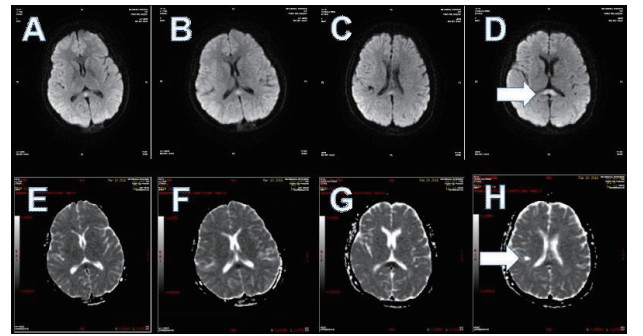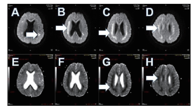 图 3 ABCD为同例患者,病变为胼胝体局灶病变(箭头所示);EFGH为同例患者,病变为胼胝体右侧放射冠区局灶病变(箭头所示) |