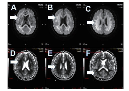 图 6 重型患者,可见胼胝体双侧放射冠区弥漫性病变 |