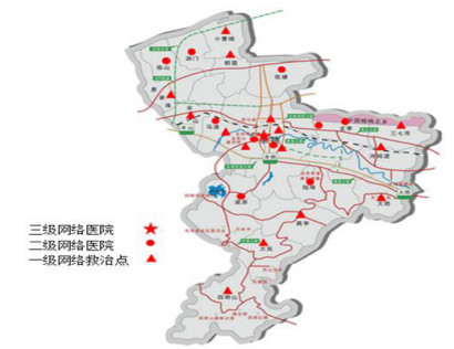 2 建立余姚市急救医疗保障体系 2.1 建设覆盖县域的三级急救网络县域所有医共体单位,按乡村卫生院(一级)—镇卫生院及其他县级医院(二级)—县人民医院(三级)的方式组成县域内的“三级急救网络体系”,该网络目前已经覆盖县域内的26家基层医疗单位,并开发了余姚市急诊急救医疗保障系统软件,达到信息互通互联和共享[3]。医共体牵头医院和核心医院能实时指导,并做好接诊患者的相关准备。网络成员单位分布及三级网络医院分级架构见图 2~3。