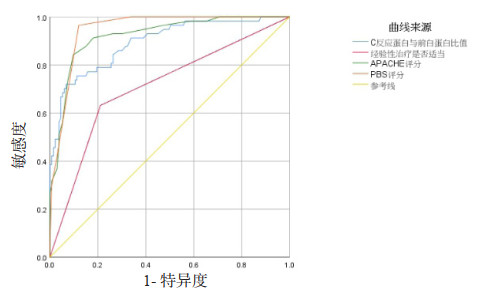 根据单因素分析结果,将P < 0.1的危险因素作为协变量构建二元logistic回归方程,多因素回归分析结果示CRP/PA、不适当的经验性治疗、APACHEⅡ评分、PBS评分是患者不良预后的独立危险因素(P < 0.05),结果如表 4所示。Spearman相关性分析示不适当的经验性治疗(ρ=0.376;P < 0.01)、CRP/PA(ρ=0.440;P < 0.01)、PBS评分(ρ=0.529;P < 0.01)均与APACHEⅡ评分显著相关,不适当的经验性抗菌治疗,CRP/PA水平、PBS评分、APACHEⅡ评分越高提示患者病情越严重,预后越差。