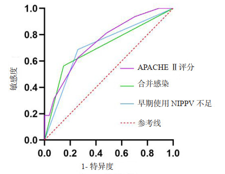 图 1 APACHE Ⅱ评分、合并感染、早期使用NIPPV不足对NIPPV失败的ROC曲线 Fig 1 ROC curve of APACHE Ⅱ score, early concurrent bacterial or fungal infections and insufficient use of NIPPV at an early stage for NIPPV failure |