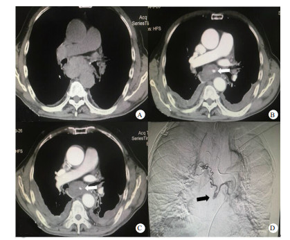 图 1 患者影像学检查结果(A:患者入院后胸部CT检查结果; B:患者胸部增强CT结果,箭头所指处为支气管动脉瘤显影; C:患者术后复查增强CT结果,箭头所指处为动脉瘤已栓塞; D:患者造影中结果,箭头所指即左右支气管动脉交通支中的动脉瘤) |