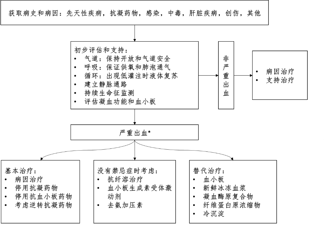 严重出血:指凝血功能障碍患者出现大量失血,或者重要的封闭体腔内出血(如颅内出血、眼眶内出血、后腹膜出血),或者需要手术、介入或内镜止血的活动性出血 图 2 急性出血性凝血功能障碍处理流程 |