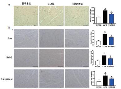 A:大鼠心室肌TUNEL染色。B:大鼠心肌凋亡相关蛋白表达情况。与假手术组相比:aP<0.05;与CLP组相比,bP<0.05 Immunohistochemistry 图 2 TUNEL和免疫组织化学检测评价心室肌凋亡改变 Fig 2 Ventricular myocyte apoptosis was measured by TUNE and Immunohistochemistry |