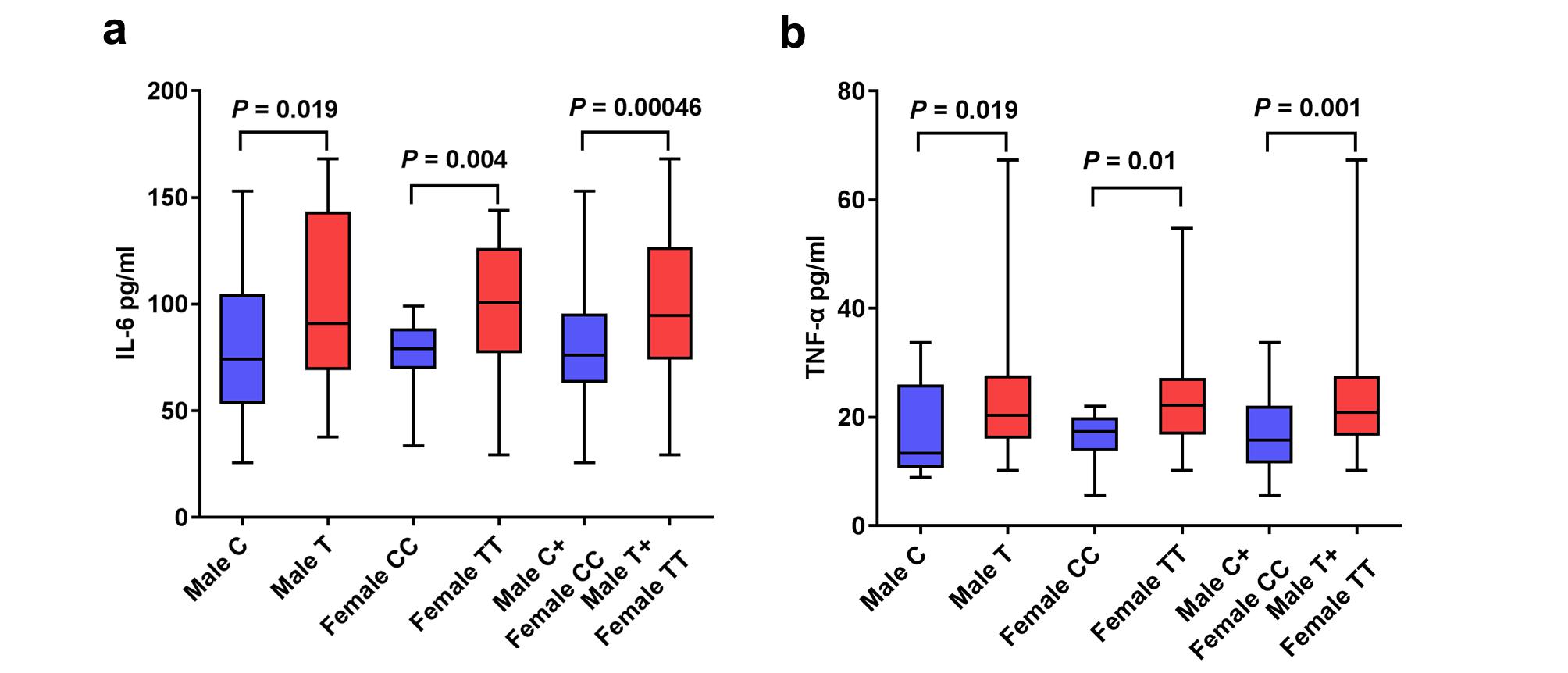 rs3827440是非同义突变,可以导致编码氨基酸改变,Chu等[5]研究发现rs3827440变异引起健康个体外周血单个核细胞GPR174 mRNA表达的变化,为探讨GPR174基因变异对脓毒症发病的影响机制,进一步探讨rs3827440变异对脓毒症患者炎症介质表达的影响。收集116例脓毒症患者入院24 h内的血清,其中15例女性携带rs3827440 CC等位基因,28例女性患者携带TT基因型,25例男性患者携带C等位基因,48例男性患者携带T等位基因。携带rs3827440杂合子的女性患者被排除,以避免X染色体失活对基因表达的影响。研究结果发现,携带等位基因T男性和基因型TT女性患者,血清IL-6和TNF-α的浓度高于携带等位基因C和CC基因型的患者(IL-6: P = 0.019、P = 0.004;TNF-α:P = 0.019、P = 0.01)。携带等位基因T男性和基因型TT女性患者联合分析后,血清IL-6和TNF-α的浓度明显高于携带等位基因C和CC基因型的患者(IL-6:P = 0.00046;TNF-α:P = 0.001) (见图 1-a和1-b);Logistic回归分析去除年龄、APACHE Ⅱ和SOFA评分等因素后,仍具有统计学意义(Padj = 0.0093, Padj = 0.016)。