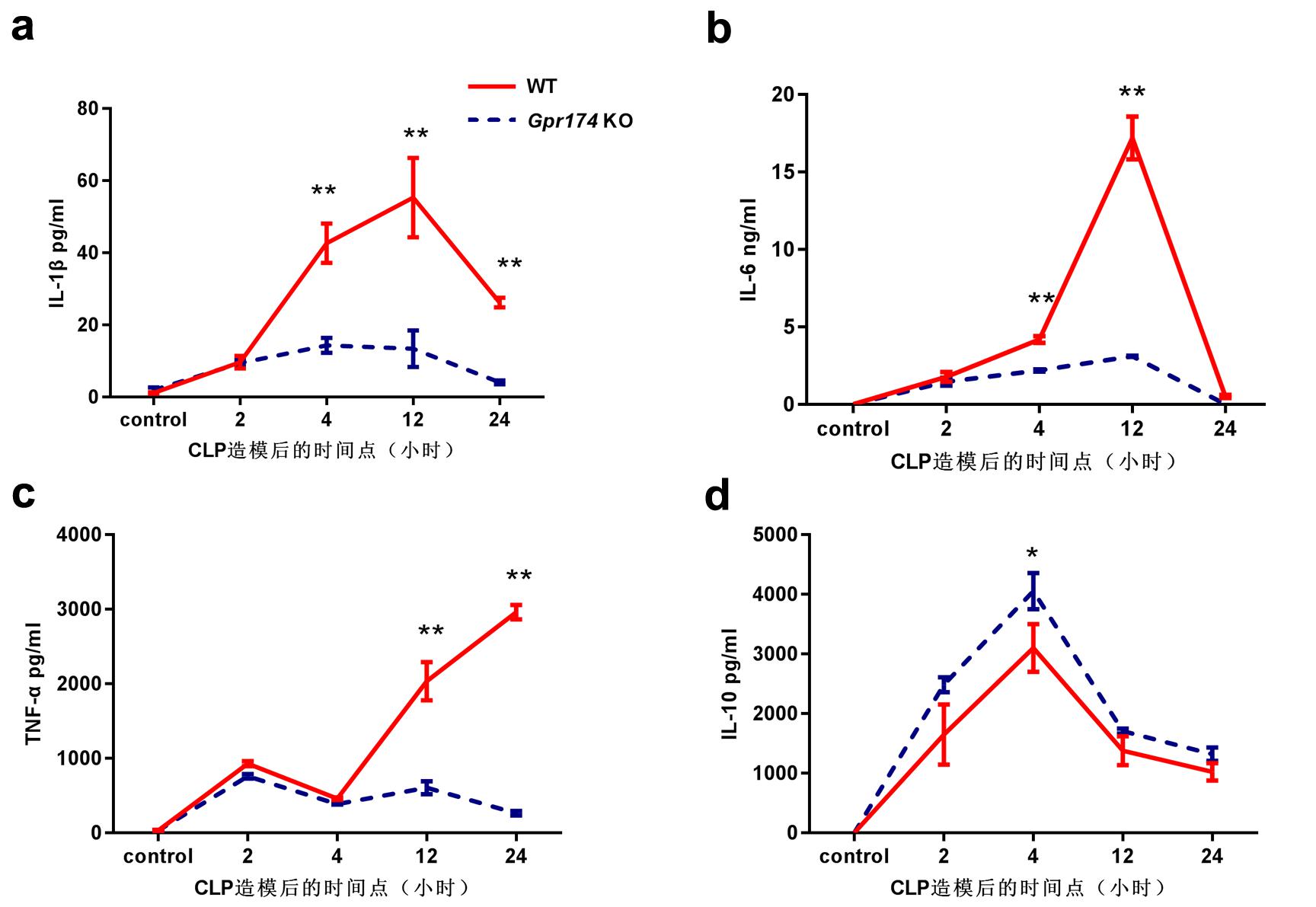 利用Gpr174 KO和同窝出生的野生型小鼠,CLP方法制作脓毒症模型,探讨Gpr174对脓毒症小鼠炎症反应和生存率的影响。研究发现CLP造模成功后,Gpr174 KO小鼠脓毒症病死率明显下降,低于野生型小鼠(图 2),且体温和体质量恢复快于野生型小鼠。进一步检测炎症活化急性期细胞因子IL-1β、IL-6、TNF-α和IL-10的水平。结果发现,与野生型小鼠相比,Gpr174基因敲除小鼠存在炎症反应的峰值变化,促炎症细胞因子的水平明显降低(IL-1β、IL-6和TNFα),而参与拮抗炎症反应的IL-10水平高于野生型,差异有统计学意义(图 3)。