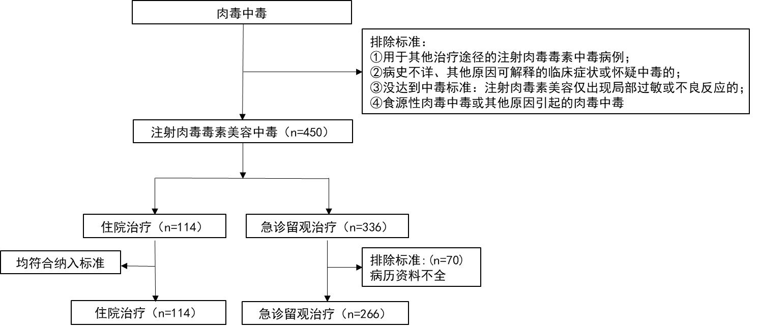 2 结果 2.1 基本情况2016年3月至2019年6月本中心共计接诊注射肉毒毒素美容中毒患者450例,根据纳入及排除标准,排除70例,本研究共入选病例380例,其中住院治疗114例,急诊留观治疗266例(图 1)。对注射肉毒毒素相关信息进行分析,其中:(1)注射场所:主要在美容院或美容工作室(311例,81.8%),其次为患者自行或委托熟人于家中(31例,8.2%)注射。(2)肉毒毒素品牌:保妥适101例(26.6%),衡力80例(21.1%),此两种品牌多为仿制品;其他品牌包括韩国Medytox公司产品(52例,13.7%)、英国Dysport(13例,3.4%)等;2018年11月,市面上出现了一批国产除皱产品,经我们检验,该产品中含有肉毒毒素,本研究中有28例因注射此除皱产品中毒;有105例(27.6%)并不知晓自己所注射的品牌。(3)注射剂量:有116例(30.5%)对自己所注射的肉毒毒素剂量未知;在其余病例中,<100 U的27例,100-299 U的154例,300-499U的67例,500-699 U的12例,≥ 1 000 U的4例。(4)注射部位:最多的是咬肌155例,其次为腓肠肌146例,再次为鱼尾纹93例、额纹88例等。