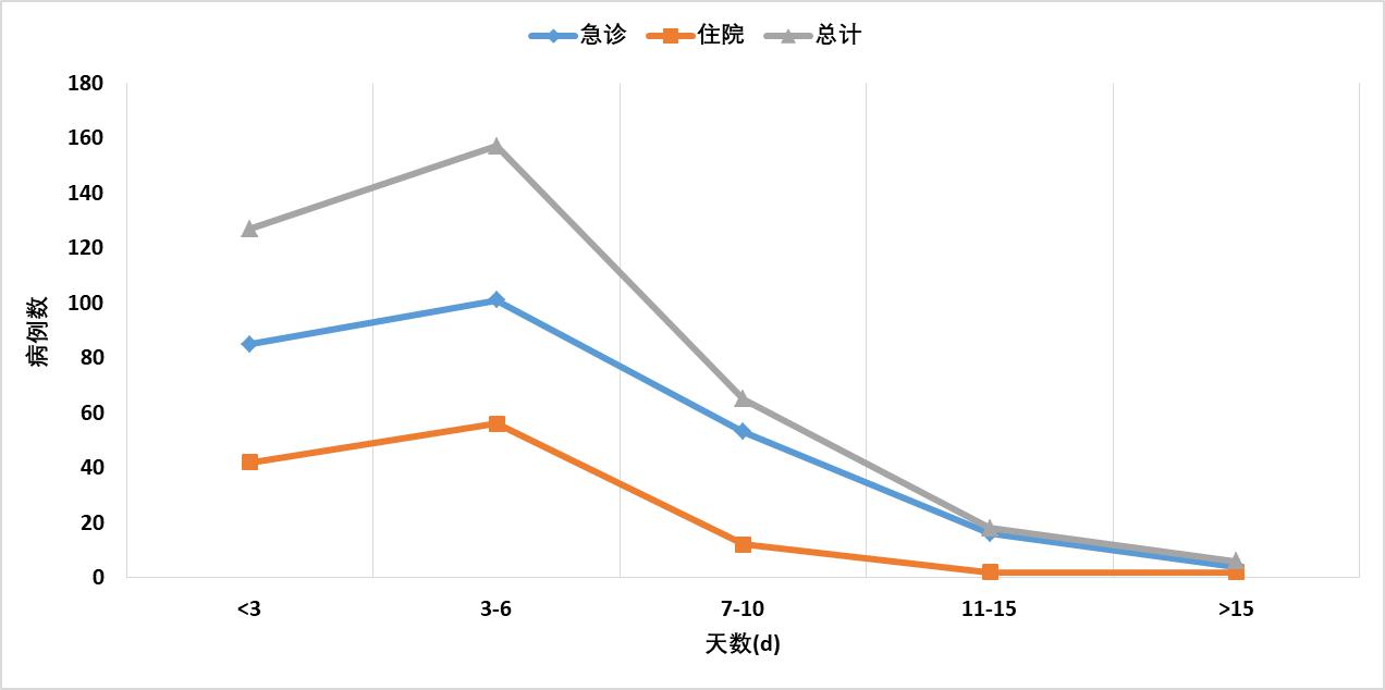 (1)本研究中,除3例急诊病例未治疗外,其余患者均给予了营养神经、补液、改善微循环、维持水电解质平衡、营养支持等综合治疗。有309例给予了肌内注射或脱敏注射肉毒抗毒素(单价A型)(中国兰州生物制品研究所生产,以下称抗毒素)1万U/d,最多的使用了10 d(图 3);其中,急诊病例有213例使用了抗毒素治疗,使用剂量2(2 ~ 3)万U,总治疗时间4(3 ~ 7)d;住院病例有96例使用了抗毒素治疗,使用剂量3(3 ~ 5)万U,显著高于急诊病例(χ2=49.386,P < 0.05),总治疗时间8(5 ~ 11)d,显著长于急诊病例(χ2=59.288,P < 0.05)。(2)在发病—使用抗毒素时间间隔上,出现症状0 ~ 9 d内接受抗毒素治疗的最多,共计171例,超过发病时间1个月后接受抗毒素治疗的有17例,最长的达165 d。(3)经治疗的患者均好转离院,通过3个月至半年随访,所有患者未出现后遗症或复发情况。