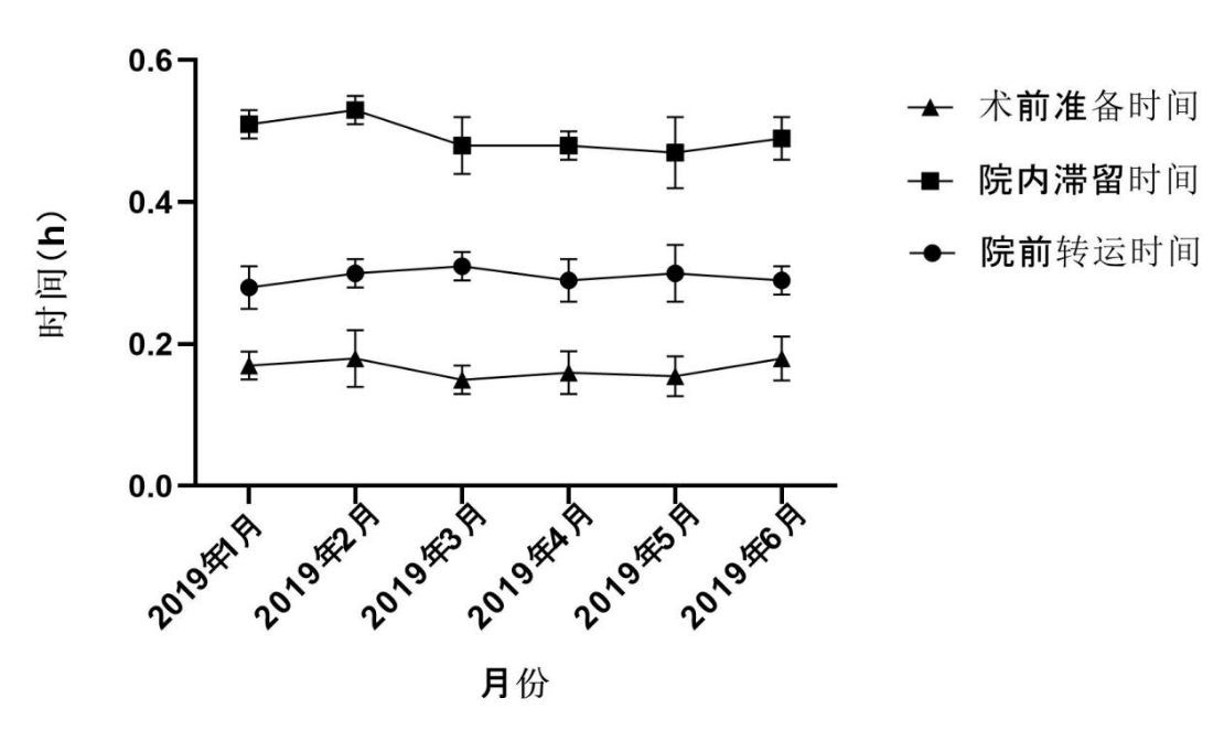 通过筛选,对院前转运、院内滞留、术前等候3个时间节点关键因素进行实施。院前以危急重症救治地图,提高单位距离内的转运速度,规范首张心电图传输时间,制定转运途中静脉开放执行标准;建立流动手术室与MDT救治团队双向转运。诊间以固化院内快速病情评估清单,开放绿色通道,优化无折返急诊救治路径;术前以成立杂交手术室,MDT团队牵头科室负责制,完善总值班及责任医师随行制度,急诊耗材二级库,手术无障碍通道。