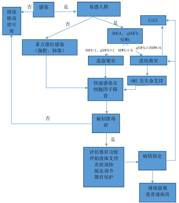 5 结语脓毒症起始于感染,经过细胞因子风暴、毛细血管内皮损伤、毛细血管渗漏、微血栓形成和组织灌注下降,最终导致器官功能损害。多年来,医学界已在器官功能保护、替代等方面积累了丰富的实践经验,但脓毒症救治效果仍有待提高,在发生感染后至走向脓毒症的过程中所作的工作还很有限。其原因一是脓毒症病理生理复杂、临床难点多;二是对脓毒症预防认识的局限性。急诊医学作为一个接触患者最早的临床专科,其工作特点与优势就在于对疾病的早期诊断、危险分层、合理分流以及科学救治。急诊脓毒症预防流程见图 1。通过早期干预疾病的病理生理发展进程,实现脓毒症的阻断,进而降低脓毒症的发生率。另一方面,通过对围脓毒症期患者的合理诊治,降低脓毒症的病死率。当然,这项工作刚刚起步,MODS还面临着众多挑战,例如感染性疾病的复杂性,易感人群的复杂性,细胞因子风暴的启动和发展的复杂性等。脓毒症的预防与阻断工作还有赖于所有临床工作者和基础研究人员的共同努力,可以相信这是一个好的开端。PSCC工作的不断深入一定能够取得令人满意的成果,惠及学科,惠及社会,惠及百姓。
