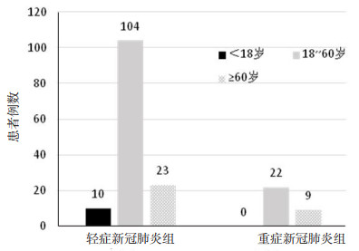 图 1 轻症和重症患者年龄段分布 Fig 1 Age distribution of the mild and severe groups |