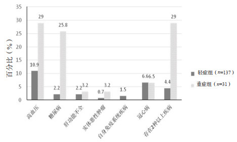 168例患者中有40例(23.8%)合并高血压、糖尿病等多种基础疾病,其中轻症组27例,占19.7%;重症组13例,占41.9%。重症组合并高血压(29.0% vs 10.9%)及糖尿病比例(25.8% vs 2.2%)均明显高于轻症组。此外,轻症组和重症组中分别有3例和1例合并肝功能不全;各有1例合并恶性肿瘤;轻症组有2例合并自身免疫性疾病;轻症组和重症组分别有9例和2例合并冠心病;上述合并症在两组中的比较差异无统计学意义(P < 0.05)。重症组同时有2种基础疾病者也明显多于轻症组(29.0% vs 4.4%)。两组病例合并基础疾病情况比较见图 2和表 1。