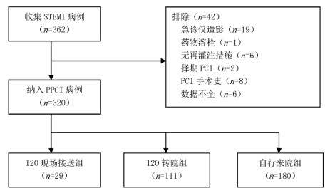 1.2 研究分组与数据收集根据STEMI患者到达胸痛中心的方式不同将研究对象分为三组:急救人员在院外现场将患者直接送达胸痛中心(120现场接送组);急救人员将患者从网络医院(区内不具备PCI能力的医疗卫生机构)转院至胸痛中心(120转院组);患者从院外现场或网络医院通过除急救车以外的各种交通工具到达胸痛中心(自行来院组)。