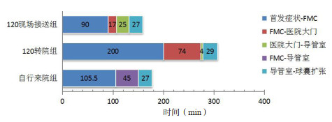 首发症状到球囊扩张时间中位数为221 min,三组间比较发现,120现场接送组用时最少,为176 min,明显少于其他两组(P < 0.05)。S2FMC这一时间延长是导致治疗延迟的主要原因,其占比分别为120现场接送组的51.14%、120转院组的63.29%、自行来院组的55.26%,见图 2。