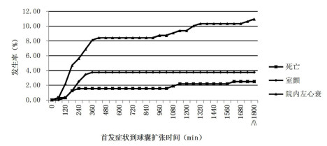3.3 EMS系统在STEMI救治体系中的作用首发症状早期是STEMI的生命脆弱期,本研究发现,纳入研究STEMI患者中的100%室颤病例、74.29%的急性左心衰病例和62.50%的院内死亡病例均发生在从首发症状到球囊扩张的约6 h内,随后发生率趋于平稳。EMS系统往往是STEMI体系中最先接触患者的切入点之一,EMS对STEMI救治体系的作用主要包括以下两方面。