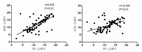 图 2 EEO-ΔRVI、EIO-ΔRVI与VE-ΔRVI的相关性分析(n=57) Fig 2 Correlation analysis between EEO-ΔRVI, EIO-ΔRVI and VE-ΔRVI (n=57) |