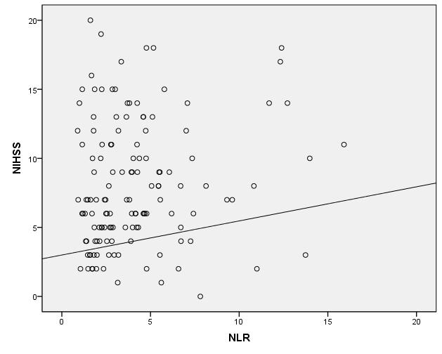 图 1 NLR与NIHSS评分的相关性(r =0.145, P=0.007, n=147) Fig 1 The correlation of NLR and NIHSS score (r=0.145, P=0.007, n=147) |