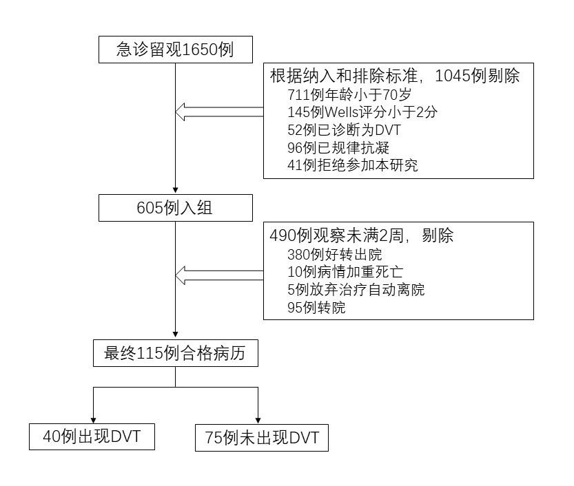 1 资料与方法 1.1 一般资料本研究为前瞻观察性研究, 入选自2018年2月1日至2019年1月31日期间, 北京朝阳医院急诊科办理留观住院的患者, 符合以下条件者为纳入对象。纳入标准:年龄≥70岁; Wells评分为中低危(Wells评分≤2分); 患者连续留观两周时间; 同意参加本次研究者。排除标准:年龄小于70岁; 入院前已经诊断为DVT; 入院前接受规律抗凝者; 拒绝参加本研究者。本研究经医院伦理委员会审批(编号:2020-科-324)。