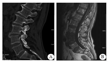图 1 患者骨科门诊就诊影像学结果(A: CT示腰4椎体上缘局部骨质吸收、破坏, 椎旁软组织稍肿胀; B:MRI示腰4椎体上缘局部骨质破坏, 腰3/4椎体斑片状骨髓水肿, 椎旁软组织水肿) |