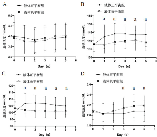 A:液体正平衡组和液体负平衡组患者入ICU后5 d(D1-5)血清钾离子浓度;B:液体正平衡组和液体负平衡组患者入ICU后5 d(D1-5)血清钠离子浓度;C:液体正平衡组和液体负平衡组患者入ICU后5 d(D1-5)血清氯离子浓度;D:液体正平衡组和液体负平衡组患者入ICU后5 d(D1-5)血清钙离子浓度(aP<0.05) 图 1 比较液体正平衡组和液体负平衡组患者入ICU后5 d(D1-5)血清电解质浓度 Fig 1 Comparison of serum electrolyte between the positive fluid balance and negative fluid balance group from day 1 to day 5 |