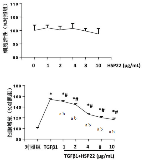 实验分组二:a.对照组(给予同等体积的PBS处理细胞48 h);b. TGFβ1刺激组(给予TGFβ1 10 ng/mL处理48 h);c. 1 μg/mL Hsp22+TGFβ1组(同时给予1 μg/mL Hsp22和TGFβ1 10 ng/mL处理48 h);d. 2 μg/mL Hsp22+TGFβ1组(同时给予2 μg/mL Hsp22和TGFβ1 10 ng/mL处理48 h);e. 4 μg/mL Hsp22+TGFβ1组(同时给予4 μg/mL Hsp22和TGFβ1 10 ng/mL处理48 h);f. 8 μg/mL Hsp22+TGFβ1组(同时给予8 μg/mL Hsp22和TGFβ1 10 ng/mL处理48 h);g. 10 μg/mL Hsp22+TGFβ1组(同时给予10 μg/mL Hsp22和TGFβ1 10 ng/mL处理48 h);处理完成的细胞每孔加入10 μl稀释后的CCK8试剂,孵育2 h后在酶标仪下检测450 nm的吸光度。细胞增殖=每组细胞的吸光度×100%/对照组的吸光度。