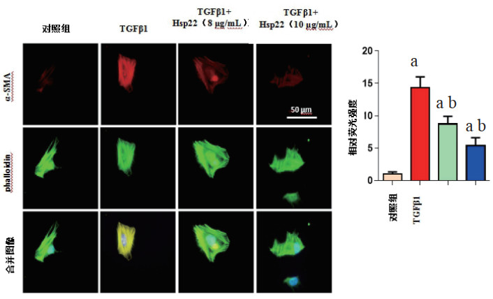 图注:镜下可见α-SMA(红色)的表达,放大倍数400倍,绿色表示phalloidin(鬼笔环肽),蓝色表示细胞核。与对照组比较, aP<0.05);与TGFβ1组比较, bP<0.05 图 2 Hsp22对α-SMA表达的影响 Fig 2 Effect of Hsp22 on α-SMA expression |