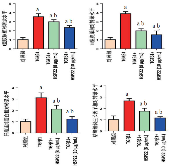 图注:与对照组比较aP<0.05;与TGFβ1组比较bP<0.05 图 3 Hsp22对促纤维化因子转录水平的影响 Fig 3 Effect of Hsp22 on transcription level of fibrotic factor |