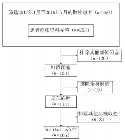 1 资料与方法 1.1 一般资料回顾2017年1月至2019年7月就诊于浙江大学附属第二医院和浙江大学附属第二医院长兴院区的连续性急性缺血性卒中取栓患者,取栓患者纳入标准为:发病6 h内;卒中前mRS 0~1分;缺血性卒中由MCA M1段闭塞引起;年龄≥18岁;NIHSS评分≥6分;ASPECTS评分≥6分。为了保证研究的一致性,本研究排除了M2段及其以远闭塞、颈内动脉闭塞、椎基底动脉系统闭塞、大脑前动脉闭塞。然后比较采用导丝成袢技术组及未采用导丝成袢技术两组在穿刺至微导管首次造影的时间(即首次造影)和围手术期并发症等方面的差异。所有患者均采用solitaire支架取栓。患者筛选流程图见图 1。