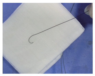1.2 具体技术术前CTA或术中全脑血管造影明确动脉闭塞部位。局麻取右侧股动脉为穿刺点,Seldinger法穿刺成功后置入股动脉鞘,脑血管造影明确动脉闭塞部位,导丝尽可能将6/8F指引导管置于离病变位置较近的目标血管以增强支撑,视情况加用中间导管。指引导管到位后撤出泥鳅导丝。将微导丝塑成”U”型袢(见图 2),路图下利用成袢的导丝将微导管带至闭塞部位远端,撤出微导丝,手推造影确认流出道后,solitaire支架到位,缓慢回撤微导管至取栓支架完全打开,再次造影观察评估闭塞再通及远端再灌注情况。保留支架5 min,负压下将取栓支架连同输送装置一起自指引导管撤出体外。再通手术完成后,等待15 min,再次经指引导管复查血管造影,如效果满意则撤除器械,缝合血管或加压包扎,结束手术。期间记录首次造影时间、围手术期并发症等数据。其中,动脉穿孔指术中导丝或导管刺破血管,见造影剂溢出。出血转化导致NIHSS增加≥4分时, 定义为症状性颅内出血[1]。动脉夹层指影像学检查具备动脉夹层的典型征象,如双腔征、线样征、内膜瓣、壁内血肿、夹层动脉瘤等[2-4]。