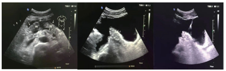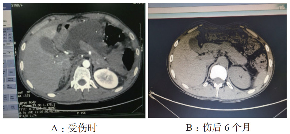 患者男,26岁,维吾尔族,以“高处坠落致腹部疼痛2 d”为主诉入院。患者于2019-03-26凌晨1时左右饮酒后不慎从2 M高处楼梯上摔下,伤及头部、腹部及腰背部,左侧面颊部见少量出血,当时神志状态不明,是否存在腹部及腰背部疼痛,无人知晓。至清晨8时左右,被家属发现俯卧于楼梯口,患者昏睡,周围未见呕吐物,楼梯上可见少量血迹,面颊部擦伤已结痂,呼唤能醒,自诉腹部及腰背部疼痛不适,无头痛、头晕,无恶心、呕吐,遂被立即送往当地县人民医院,CT检查后考虑“胰腺断裂”,给予输液治疗(具体不详),患者意识逐渐转清,可简单对答。为进一步治疗,于2019-03-26晚21:45转入阿克苏农一师医院。入院查体:体温37.1℃,呼吸20次/min,心率90次/min血压120/79 mmHg,腹部平坦,腹皮肤表面未见明显挫伤痕迹,未见胃型,未见肠型,未见蠕动波,无腹壁静脉曲张,未见手术瘢痕,全腹压痛,腹肌紧张,上腹部明显,反跳痛全腹存在,未触及液波震颤,未及腹部包块,肠鸣音减弱,1~2次/min。双肾区有叩痛,右侧明显。骨盆挤压试验(-)。急诊检查生命体征尚稳定,拟诊“腹部闭合性损伤:胰腺断裂?右肾动脉损伤、右肾坏死?”收入ICU。入院诊断:闭合性腹部损伤,胰腺断裂Ⅳ级(主胰管断裂)、弥漫性腹膜炎、右肾动脉损伤、右肾梗死。入院实验室检查:WBC:11.5×109/ L, N:92.1%, Hb 10.5 g,PCT:4.32 ng/mL。入院影像学检查:胸部+腹部增强CT(2019年3月2号晚21:45):右肺下叶炎症,右侧胸腔少量积液,双侧局部胸膜肥厚,胰腺断裂伴周围低密度病灶,考虑假性囊肿形成,右肾动脉损伤,右肾无灌注,腹腔、盆腔积液(考虑血性),腹腔内局部脂肪间隙浑浊,考虑腹膜炎,提示:腹腔内部分肠管明显扩张并积气。此报告为危急值报告!治疗经过:入住ICU,先期放置胃管行胃肠减压,4 d后起经鼻空肠营养,逐渐加量至全量;主要药物泮托拉唑抑酸护胃,生长抑素抑制胰酶分泌,头孢他定+甲硝唑抗感染;本案例入院时创伤发生已过24 h,右肾不显影提示肾动脉梗死造成右肾梗死,介入再通已过时间窗,故放弃介入,不做进一步处理;入院当天腹部增强CT提示胰腺断裂Ⅳ级,胰管完全离断,胰头与胰体尾明显分离,腹腔积液以左中上腹、左下腹居多,腹膜刺激征遍及全腹,按传统观点手术指征明确。但血流动力学稳定,读CT片并完成MRCP后,排除空腔脏器破裂,明确积液集中于上腹部和左下腹,大胆尝试在创伤ICU支持下行非手术治疗。2019-03-29患者行B超检查,示腹腔积液,积液相对集中于左中上腹和左下腹(图 1)。B超定位引导下行左上腹和左下腹穿刺引流(图 2),引出液体性状淡血性,引流效果明显,患者病情较前好转,但血象仍较高,予头孢他啶和甲硝唑抗感染。入院4 d后腹胀缓解即行经鼻空肠营养,以后视腹胀情况逐日加量,5 d后出ICU,因经济问题普通病房住院10 d,带管出院。出院1个月后来院行ERCP术置管困难,放弃置管内引流,继续腹腔引流管回家,未做任何处理。3个月后腹腔引流管自行脱落,6个月后来院复查CT(图 3),胰腺外形基本恢复正常,腹腔无积液,饮食正常,自诉家中腹腔引流管脱落后无任何不适。
