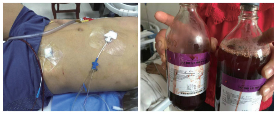 图 2 患者左中上腹部和左下腹穿刺引流 |