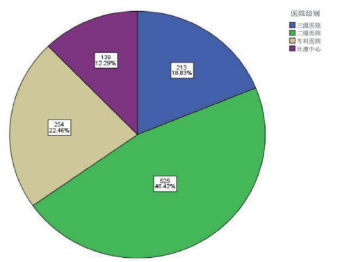 2.2 社会急救培训导师所在单位分布情况经上述两轮遴选后,如图 1所示,按医院级别分类,213人来自三级医院(18.83%),525人来自二级医院(46.42%),254人来自专科医院(22.46%),139人来自社康中心(12.29%)。