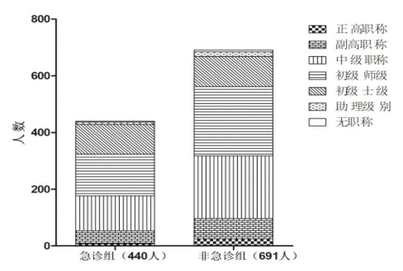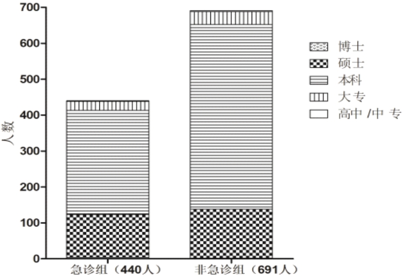 根据学历背景进行分析,如图 4所示,急诊组中:博士学位4人(0.9%)、硕士学位119人(27.00%)、学士学位290人(65.90%)、大专学历25人(5.70%)和高中/中专学历2人(0.50%);非急诊组中:博士学位2人(0.9%)、硕士学位136人(19.70%)、学士学位514人(74.40%)、大专学历36人(5.20%)和高中/中专学历3人(0.40%)。学历汇总结果显示在导师团中有相当一部分导师已接受本科以上医学教育。