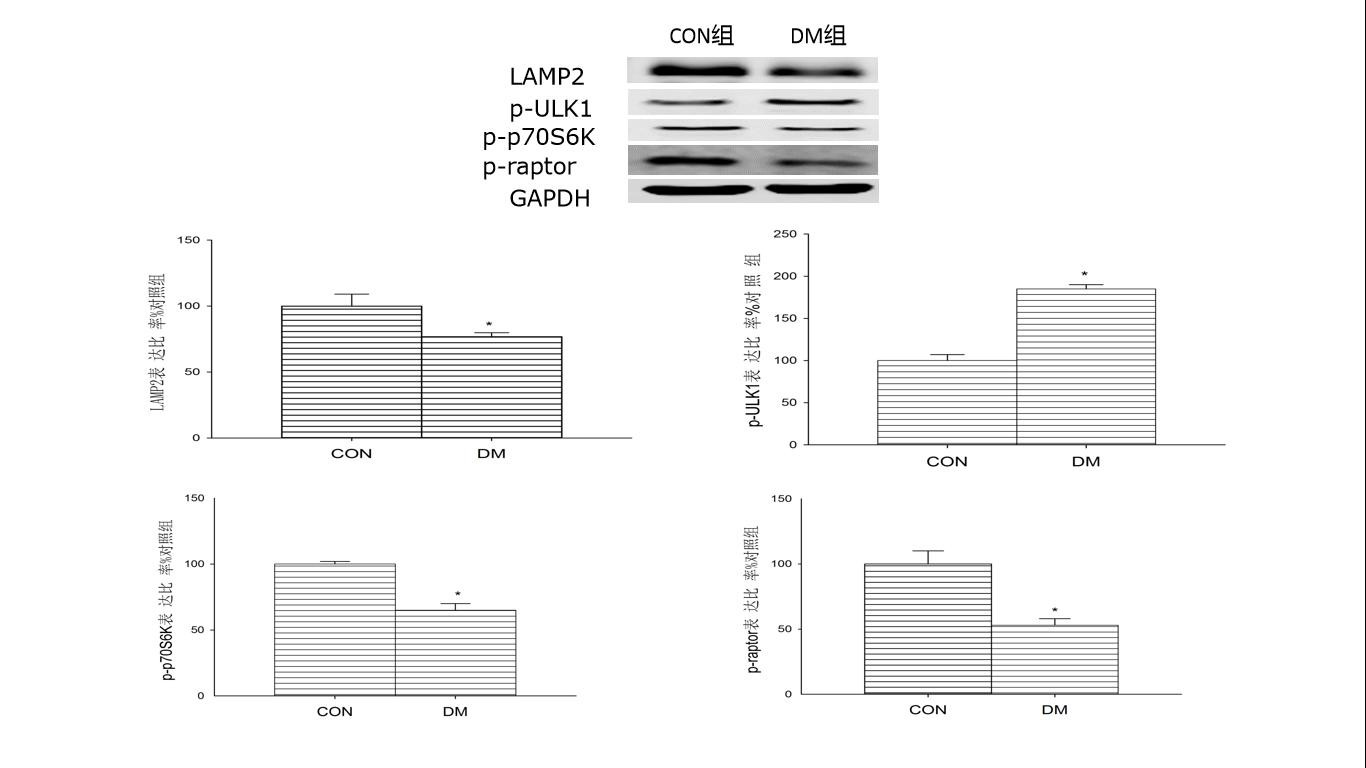 CON组为对照组,DM为糖尿病组;与CON组比较,aP < <0.05 图 1 CON组与DM组LAMP2、p-p70S6K、p-ULK1、p-raptor蛋白相对表达 Fig 1 The protein expression of LAMP2, p-p70S6K, p-ULK1 and p-raptor in the CON and DM groups |