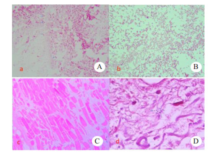 A:患者坏死组织涂片镜下观,可见G-弧菌(HE×1 000);B:菌落涂片镜下观,可见大量G-弧菌(HE×1 000);C:肌纤维肿胀、溶解(HE×400);D:高倍镜下可见弧菌(HE×1 000) 图 1 感染部位组织病原学及病理学检查 |