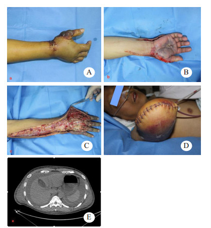 A:患肢极度肿胀,皮肤瘀斑,起水疱,手指活动障碍;B:掌侧皮肤瘀斑,指端有缺血表现;C:术中见筋膜间大量洗肉水样渗液,无积气,无化脓,无明显臭味,肌肉组织肿胀,颜色晦暗,电凝无收缩;D:患者截肢术后病情改善,感染指标下降,伤口愈合较好(中间好转期);E:腹部CT提示肝硬化 图 2 患者典型病例图片 |