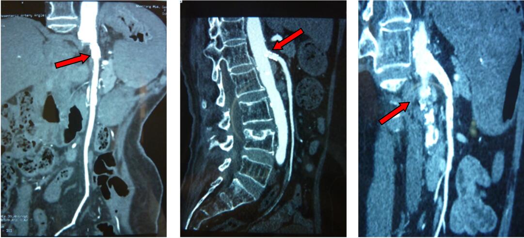 大约50%的AMI患者都是由于急性肠系膜动脉栓塞引起的(其中65%为急性上动脉栓塞)[8]。肠系膜栓塞多起源于左心房,常与心律失常(如房颤等)相关,也可由心内膜炎引起的心脏瓣膜功能障碍、菌栓脱落导致。栓子通常在正常解剖狭窄处存在。大多数位于距SMA原始位置3~10 cm处。超过20%的SMA栓塞并发于其他内脏动脉系统,如脾动脉或肾动脉栓塞。因此,在该类疾病中,若这些器官在CTA表现上发生变化,其结果常提示SMA近端血管栓塞[7]