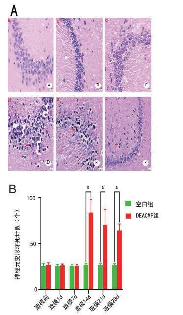 2 结果 2.1 两组大鼠海马神经元变性坏死计数的比较通过HE染色在40倍镜下观察海马区神经元,在DEACMP组造模14 d以后可见细胞排列紊乱,胞核出现固缩变形、溶解、碎裂,细胞的完整结构消失,部分区域细胞呈空泡样,取而代之是被苏木精蓝色深染、变性坏死的神经元,用Image-Pro Plus软件统计海马区变性坏死的神经元计数,结果显示在造模前、造模1 d、造模7 d两组海马神经元变性坏死计数比较,差异无统计学意义(P > 0.05),在造模14 d、造模21 d、造模28 d两组比较差异有统计学意义(P < 0.05)见表 1、图 1。
