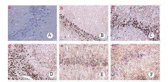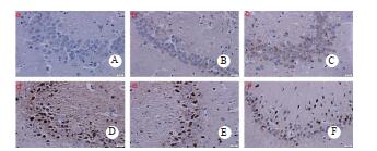 A:正常组,B:DEACMP组造模1d, C:DEACMP组造模7d, D:DEACMP组造模14d, E:DEACMP组造模21d, F:DEACMP组造模28 d. 图 2 海马CA3区iNOS的表达(免疫组织化学x400) Fig 2 Expression of iNOS in the CA3 area of the hippocampus(immunohistochemistry x 400) |