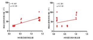 用SPSS20.0软件对DEACMP组的iNOS相对表达量与其海马CA3区的神经元变性坏死计数行相关性分析,相关系数r=0.661,P < 0.05,差异有统计学意义,两者呈正相关;nNOS相对表达量与其海马CA3区的神经元变性坏死计数行相关性分析,相关系数r=0.281,P > 0.05,差异无统计学意义,两者无相关性,见图 6。