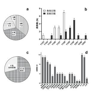 图 1 14例群体性食源性肉毒中毒患者的潜伏期与临床表现:a 14例群体性食源性肉毒中毒患者的潜伏期;b14例中毒患 者染毒豆腐乳食用日期与发病日期;c 14例中毒患者的首 发症状;d14例中毒患者的临床表现 Fig 1 The incubation period and clinical manifestations of the 14 patients with the outbreak of foodborne botulism:a The incubation period of 14 patients with the outbreak of foo dborne botulism; b The timing of consumption of contaminated bean curd and the onset date of botulism of the 14 patients; c The initial symptoms of 14 patients with the outbreak of foodborne botulism; d The clinical manifestations of 14 patients with the outbreak of foodborne botulism |