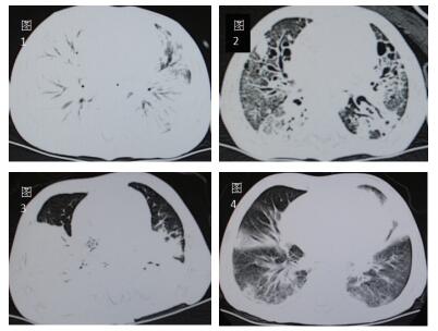 图 1 图 1、2分别示例7急性期,两肺几乎完全实变;恢复期,肺纤维化及坏死空洞图。图 3、4分别示例4急性期,背段大面积融合实变伴肺气肿;恢复期,树芽状增生,毛玻璃样变。 |