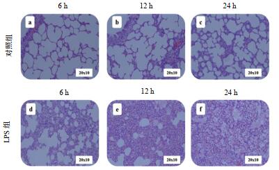 (1)分组及时间点。36只健康SD级雄性大鼠,体质量(250±25)g,随机(随机数字法)分成LPS组和对照组,每组18只,选择建模后6、12、24 h为观察点,每个时间点各6只。