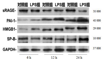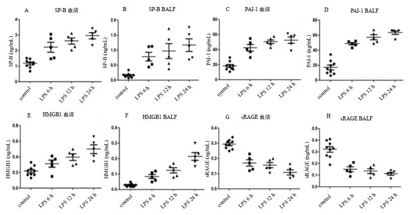 LPS组血清中HMGB1、SP-B和PAI-1进行性升高,且与对照组比较差异有统计学意义(均P < 0.05),但sRAGE与对照组相比,呈进行性下降(P < 0.05),仅24 h与其他时点的差异有统计学意义(P < 0.05)。