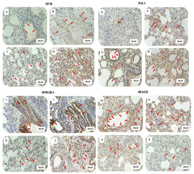 1.2.3 免疫组化大鼠肺组织石蜡块切片后置于载玻片并放入温箱中烘干,依次放入二甲苯和梯度酒精脱蜡;擦干后加一抗,即sRAGE抗体(abcam公司,美国),PAI抗体和HMGB1抗体(CST公司,美国)和SP-B抗体(SANTA公司,韩国),于4 ℃冰箱中保存过夜;PBS洗3次后加入二抗(万桥生物公司,中国)温育0.5 h;PBS冲洗3次后擦干加入链霉亲和素-生物素复合物温育0.5 h;PBS冲洗3次擦干加入显色剂;冲洗复染后依次将载玻片放入梯度酒精和二甲苯中,封片晾干进行显微镜观察。