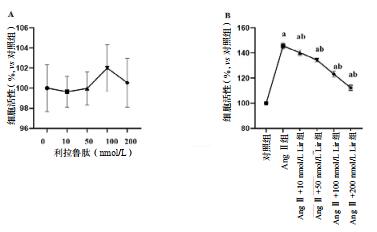 荧光染色、RT-PCR和免疫印迹处理:细胞分别接种于24孔板/6孔板和10 cm大皿,24 h后给予1 μmol/L的AngⅡ处理(AngⅡ组),不同浓度利拉鲁肽处理组同时给予1 μmol/L的AngⅡ和利拉鲁肽(1、50、100、200 nmol/L)处理48 h。