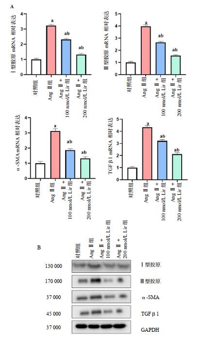 A:mRNA表达水平;B:蛋白表达水平;与对照组相比,aP < 0.05;与AngⅡ组相比,bP < 0.05;Lir为利拉鲁肽;α-SMA为平滑肌肌动蛋白α;TGFβ1为转化生长因子β1 图 3 各组成纤维细胞致纤维化因子的mRNA和蛋白的表达 Fig 3 The mRNA and protein levels of pro-fibrosis factors in each group |