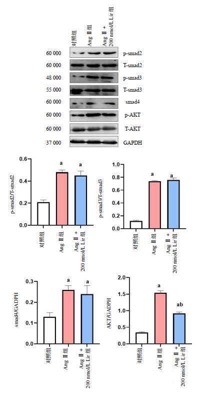 1 材料与方法 1.1 药品和试剂血管紧张素Ⅱ(angiotensin, AngⅡ)和蛋白激酶B(AKT)激活剂SC79购买于美国Sigma公司。本实验所有一抗包括:总(total, T-)AKT、smad2、smad3以及磷酸化的(phosphorylated,p-)AKT、smad2、smad3购买于美国Cell Signaling Technology公司;smad4、3-磷酸甘油醛脱氢酶(glyceraldehydes-3-phosphate dehydrogenase,GAPDH)购买于美国Santa Cruz公司;平滑肌肌动蛋白α(α-SMA)抗体和Ⅲ型胶原抗体购买于美国abcam公司。本实验所有二抗包括山羊抗兔IRdye@800 CW IgG和山羊抗小鼠IRdye@800 CW购买于美国LI-COR公司;逆转录试剂盒购买于美国Roche公司;细胞培养所用DMEM-F12培养基,胎牛血清,胰酶购买于美国Gibco公司。
